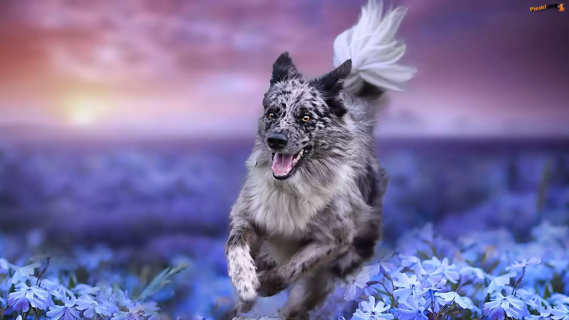 Łąka, Pies, Biegnący, Border collie, Kwiaty, Pieski
