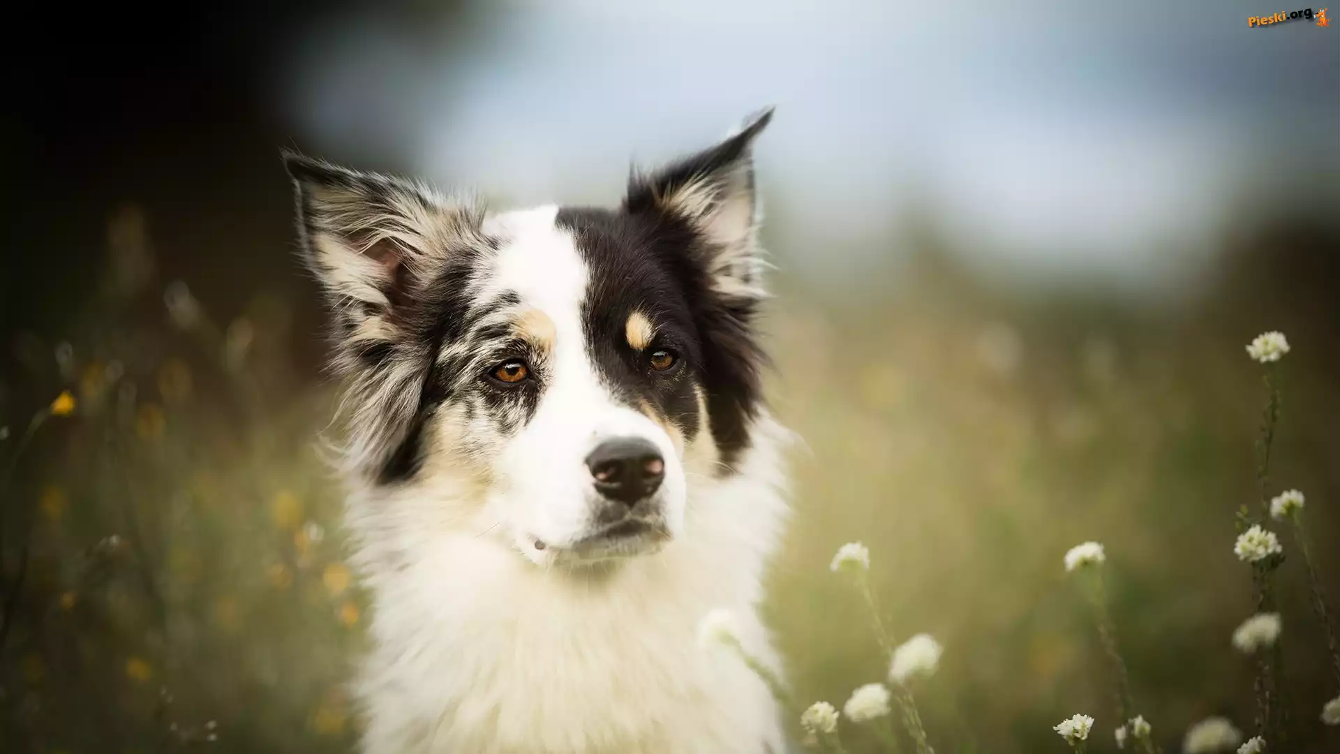 Łąka, Border collie, Pies, Mordka, Kwiaty, Pieski