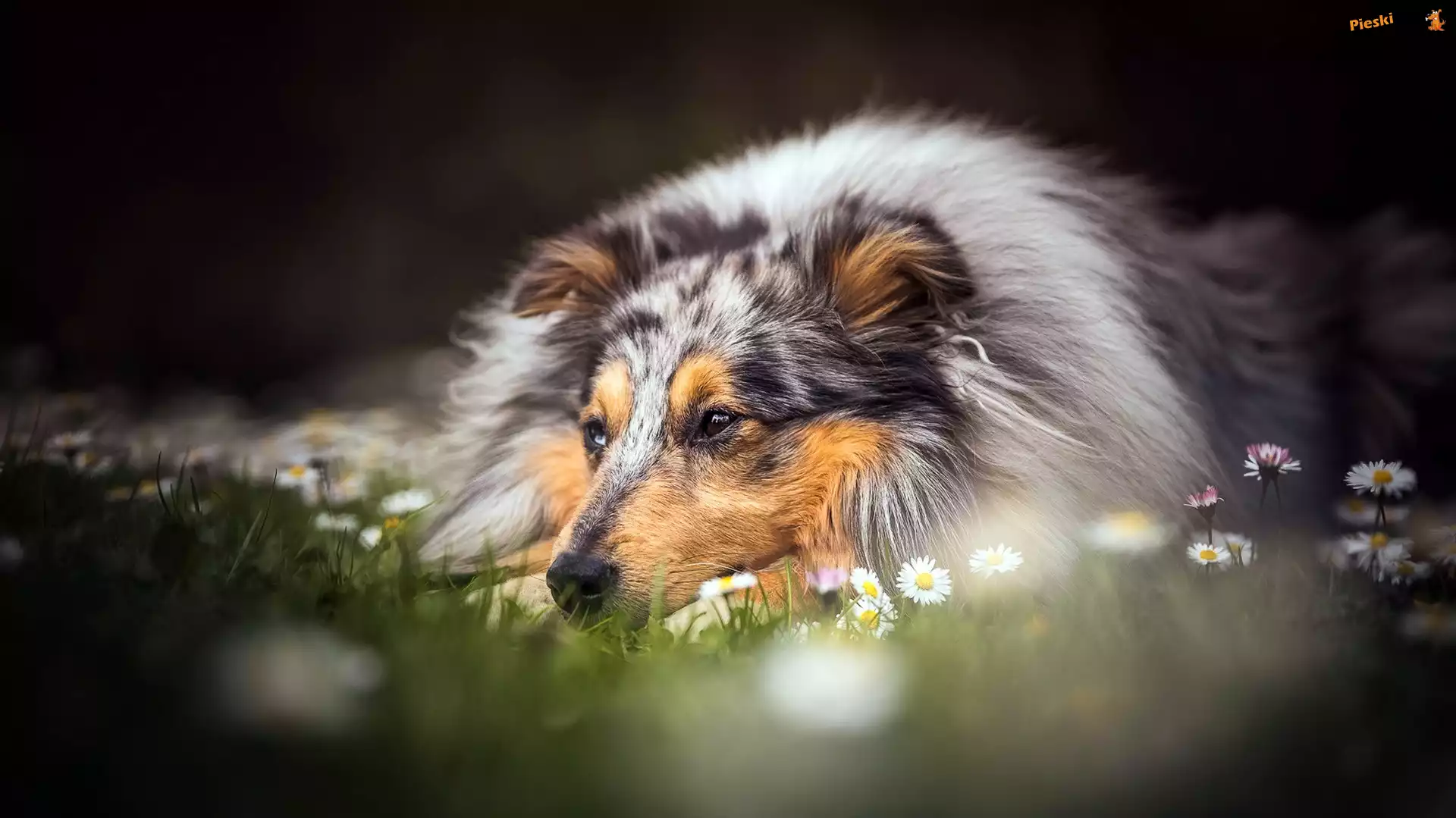 Łąka, Leżący, Owczarek szkocki długowłosy, Kwiaty