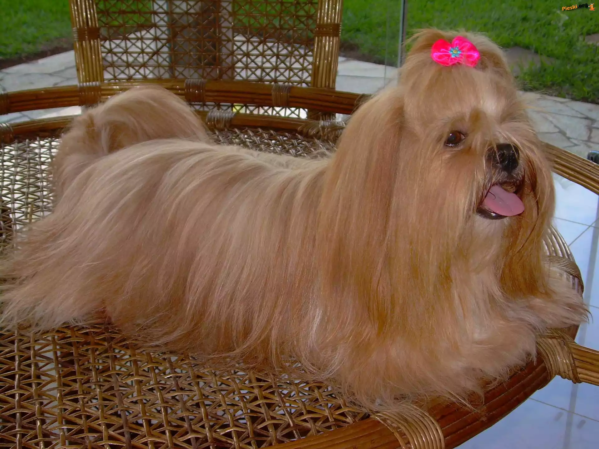 Lhasa Apso, kokardka Malutki piesek, Lhasa Apso Lana Del Rey, Pies, Lhasa Apso wyczesany, Lhasa Apso Pies, Różowa, Gerbera, Lhasa Apso