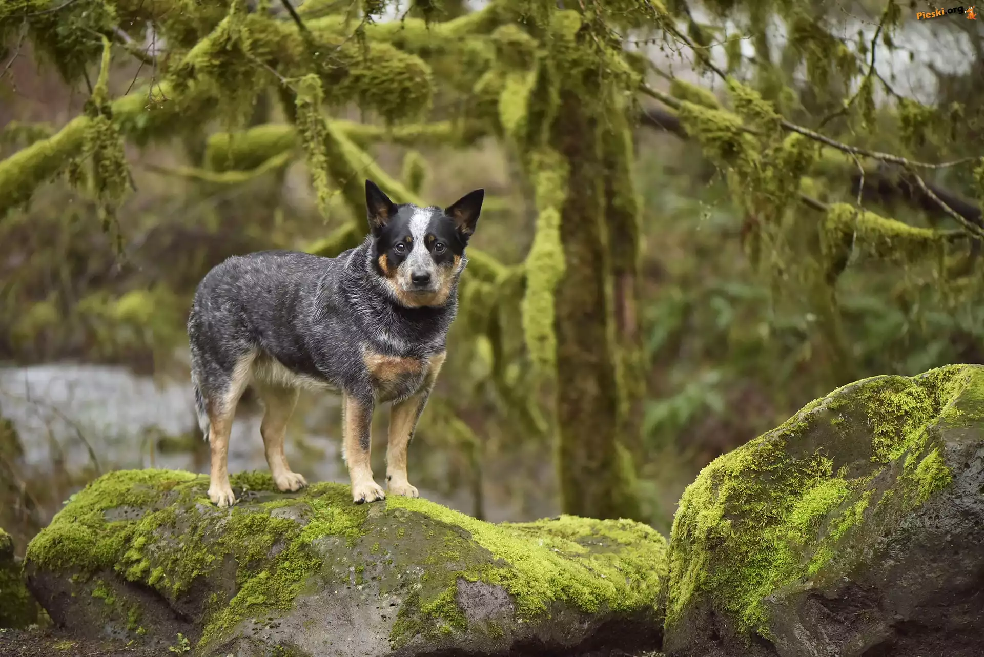 Mech, Australian cattle dog, Pies, Skały, Drzewa