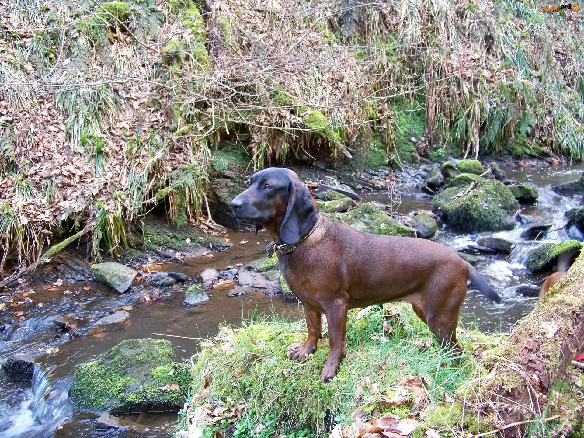 obroża, Posokowiec bawarski, jasna, śnieg Posokowiec bawarski, wodospad leżący, Posokowiec bawarski, jęzor Posokowiec bawarski, rzeka