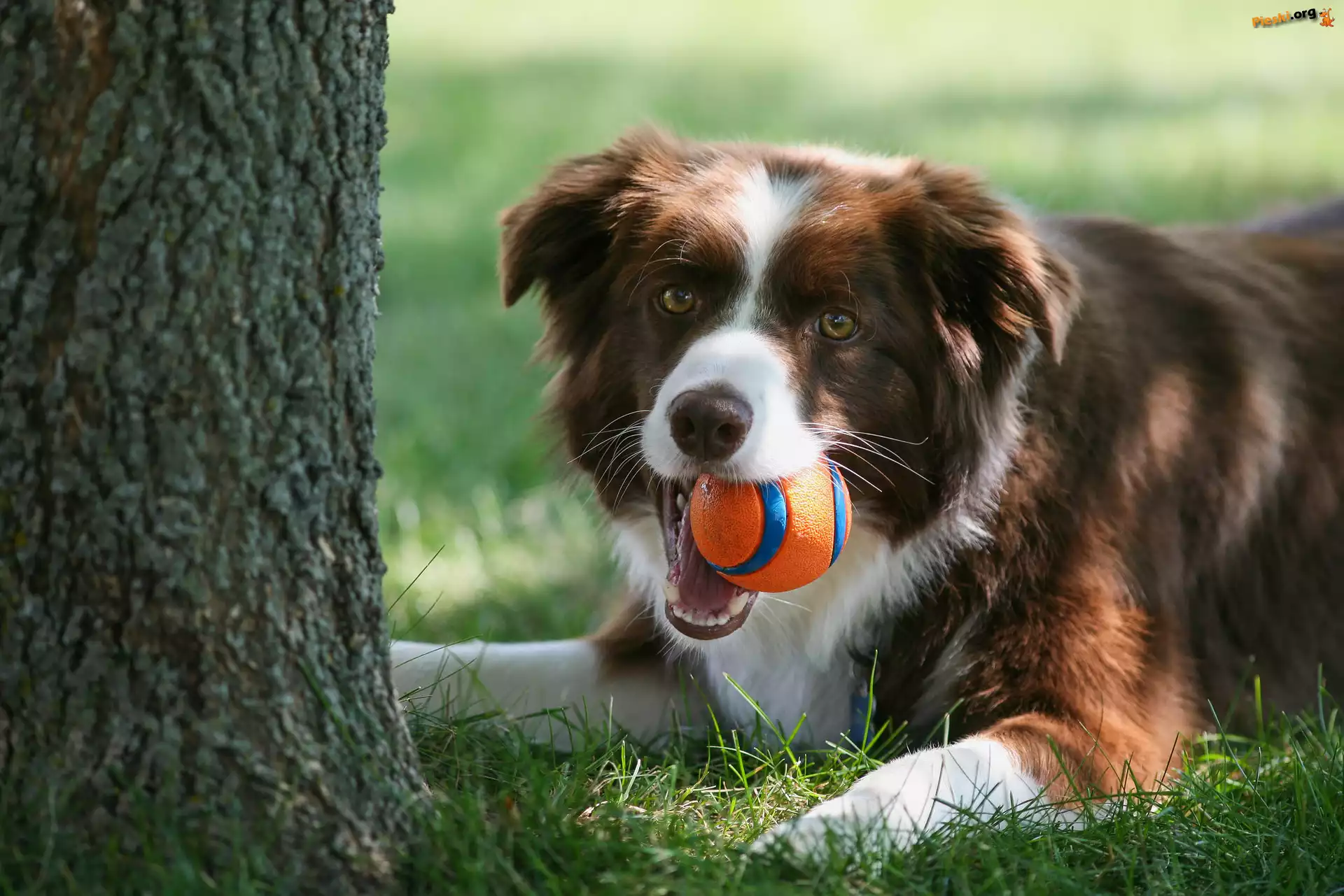 Border collie, Drzewo, Trawa, Piłeczka, Pieski