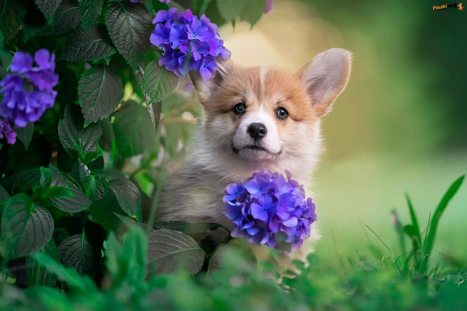 Hortensja, Kwiaty, Welsh corgi pembroke, Pies, Pieski