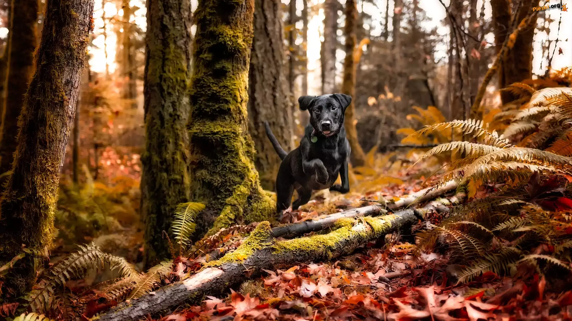 Czarny, Paprocie, Drzewa, Pies, Las, Rośliny