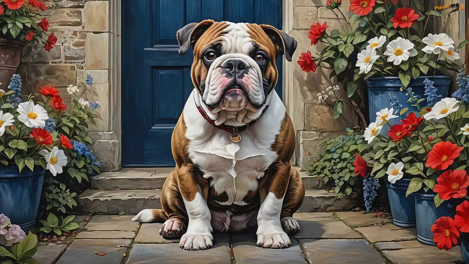 Kwiaty, Grafika, Pies, Dom, Buldog angielski, Pieski