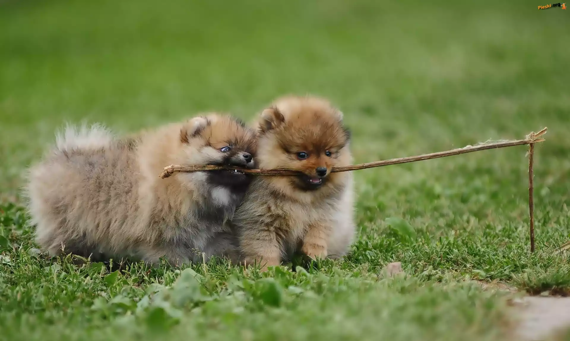 Łąka, Dwa, Patyk, Szpice miniaturowe, Szczeniaki, Pomeraniany, Zabawa, Pieski