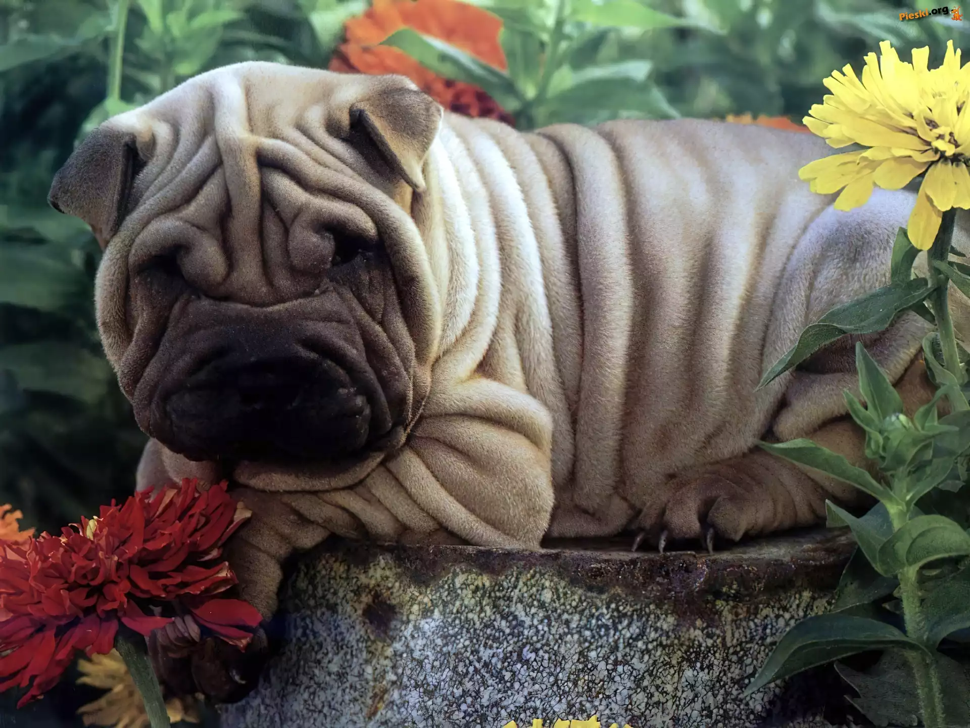 Fałdki, Shar, Pies, Pei, Kwiaty, Pieski