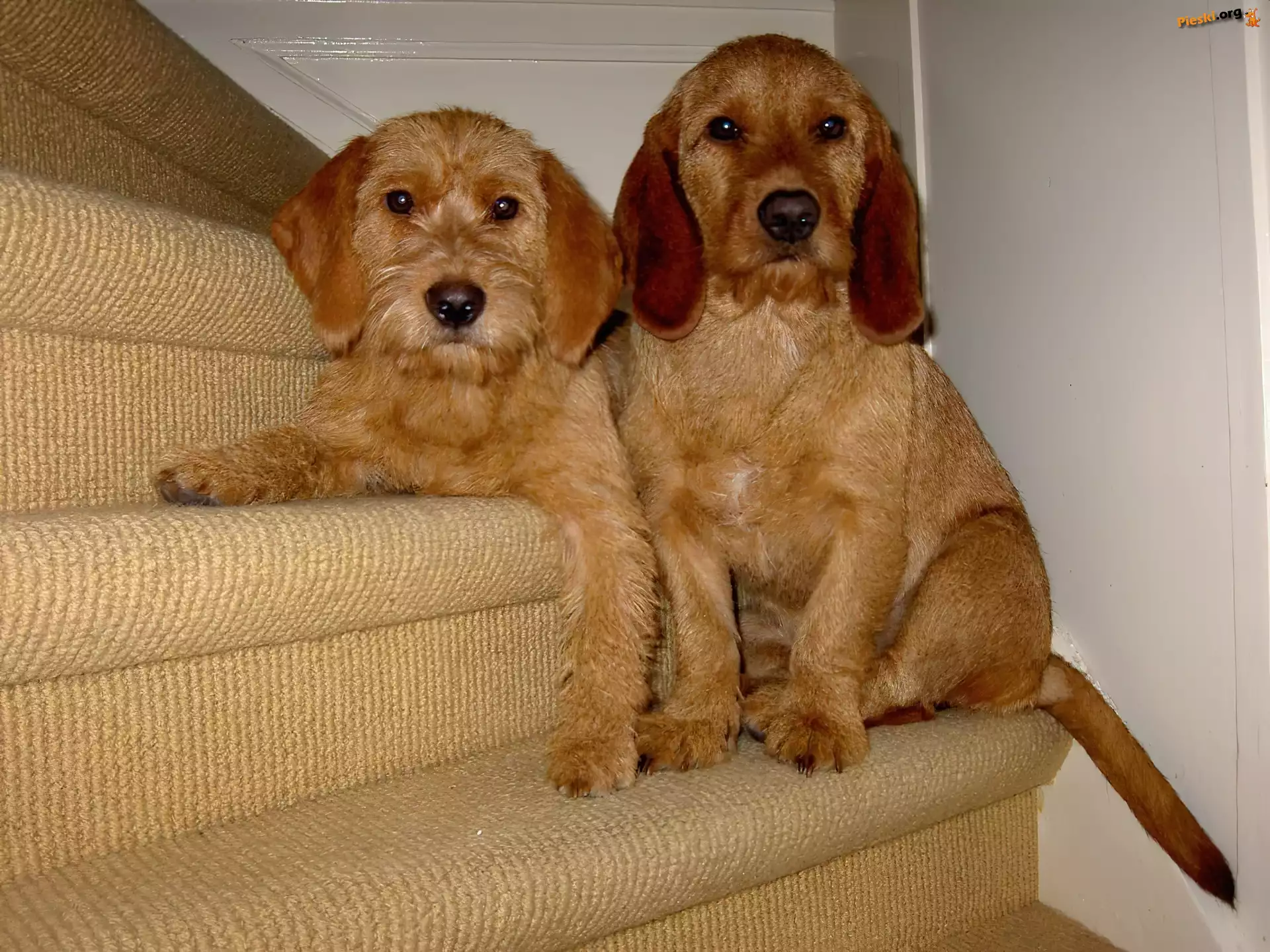 Basset Fauve de Bretagne Basset Fauve de Bretagne, dwa, słodkie, schody skulony, Basset Fauve de Bretagne