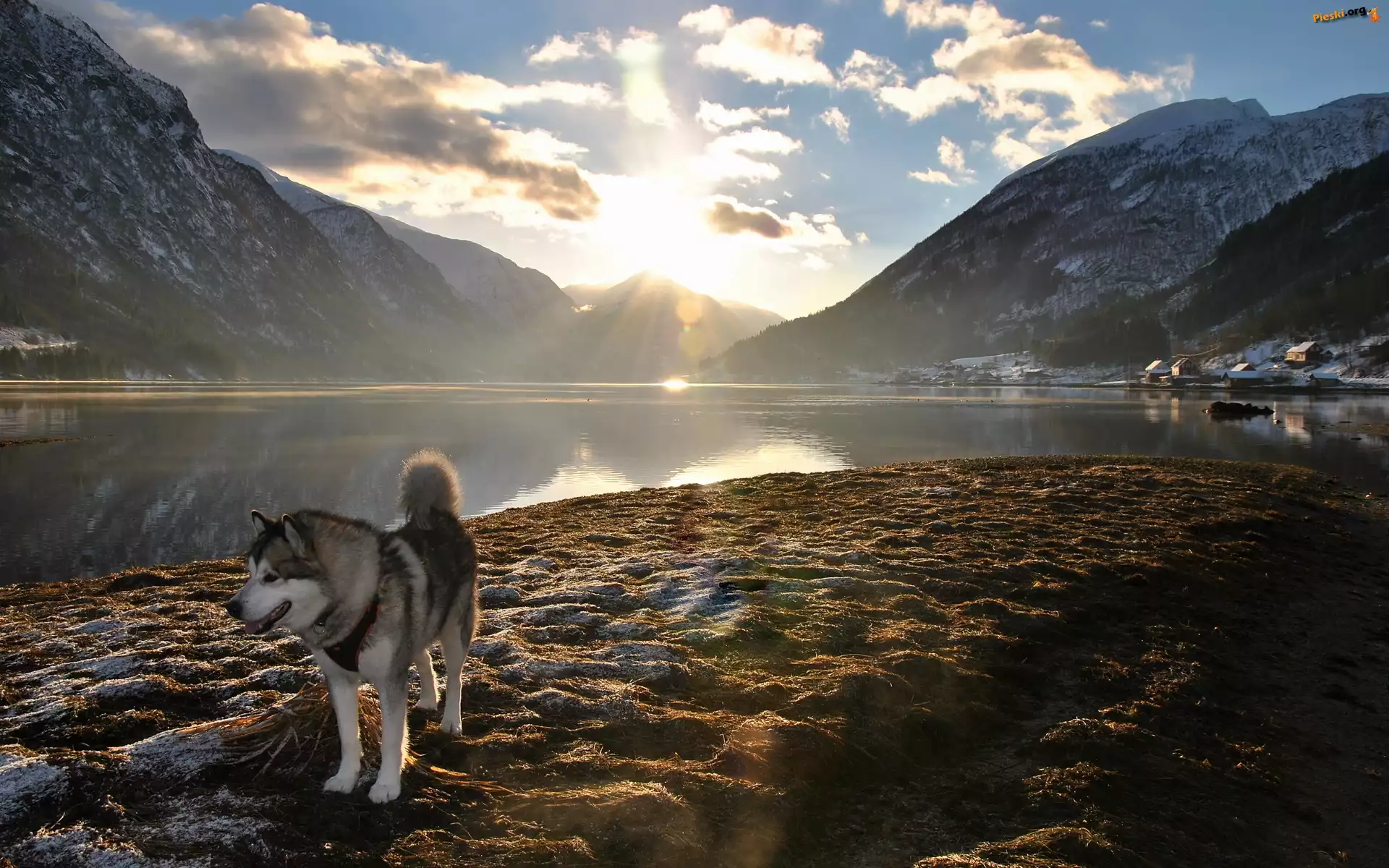 Husky, Słońca, Promienie, Jezioro, Góry, Chmury