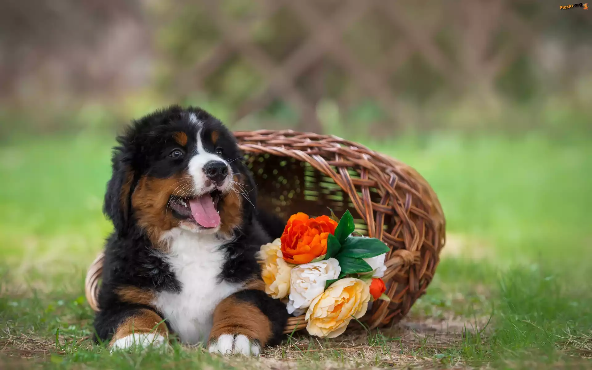 Koszyk, Berneński pies pasterski, Szczeniak, Kwiaty