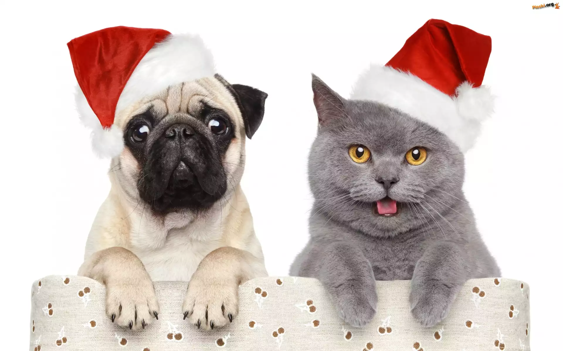 Świąteczne, Pies, Kot, Czapki, Pieski