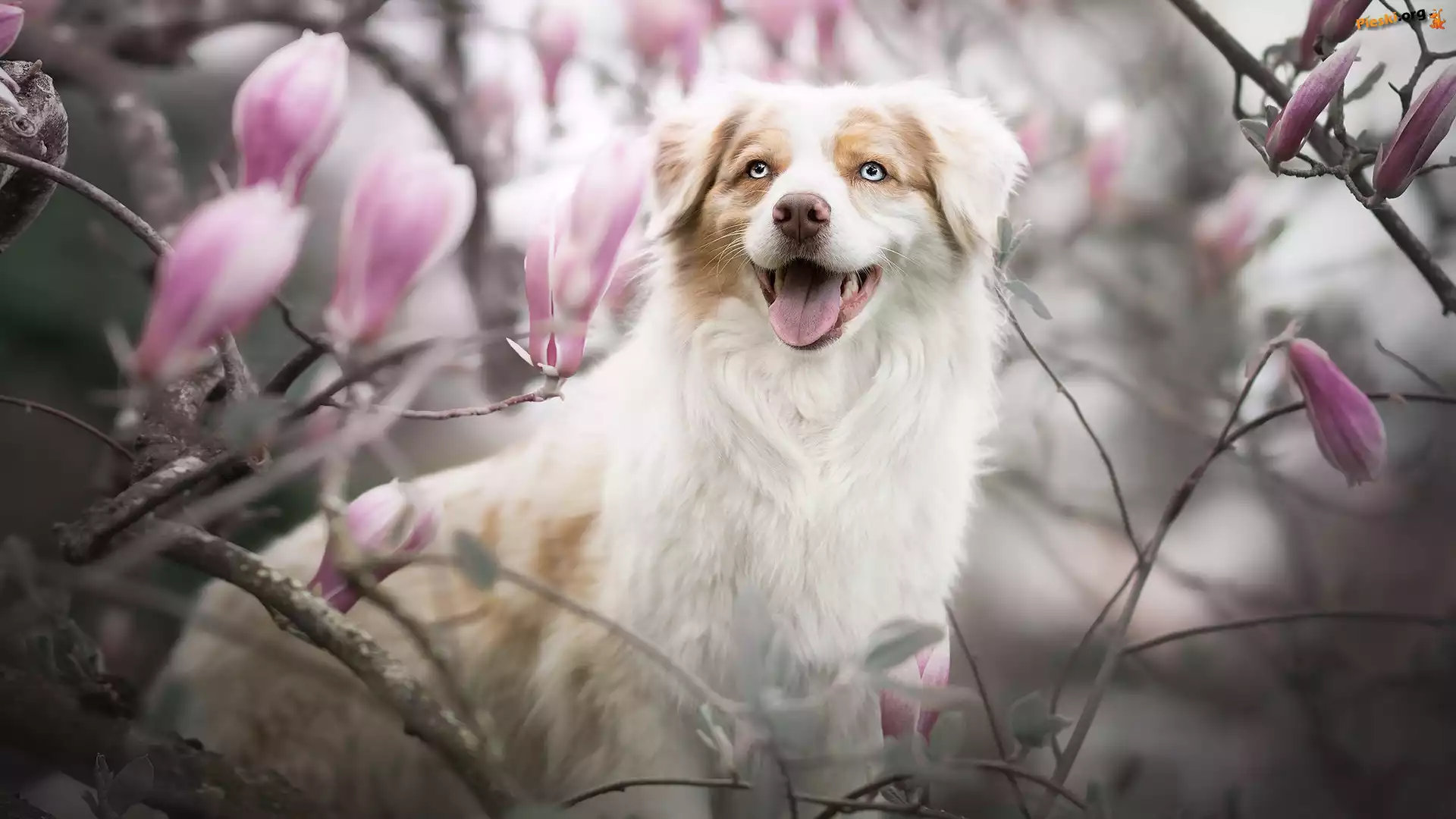 Kwiaty, Pies, Owczarek australijski, Magnolie