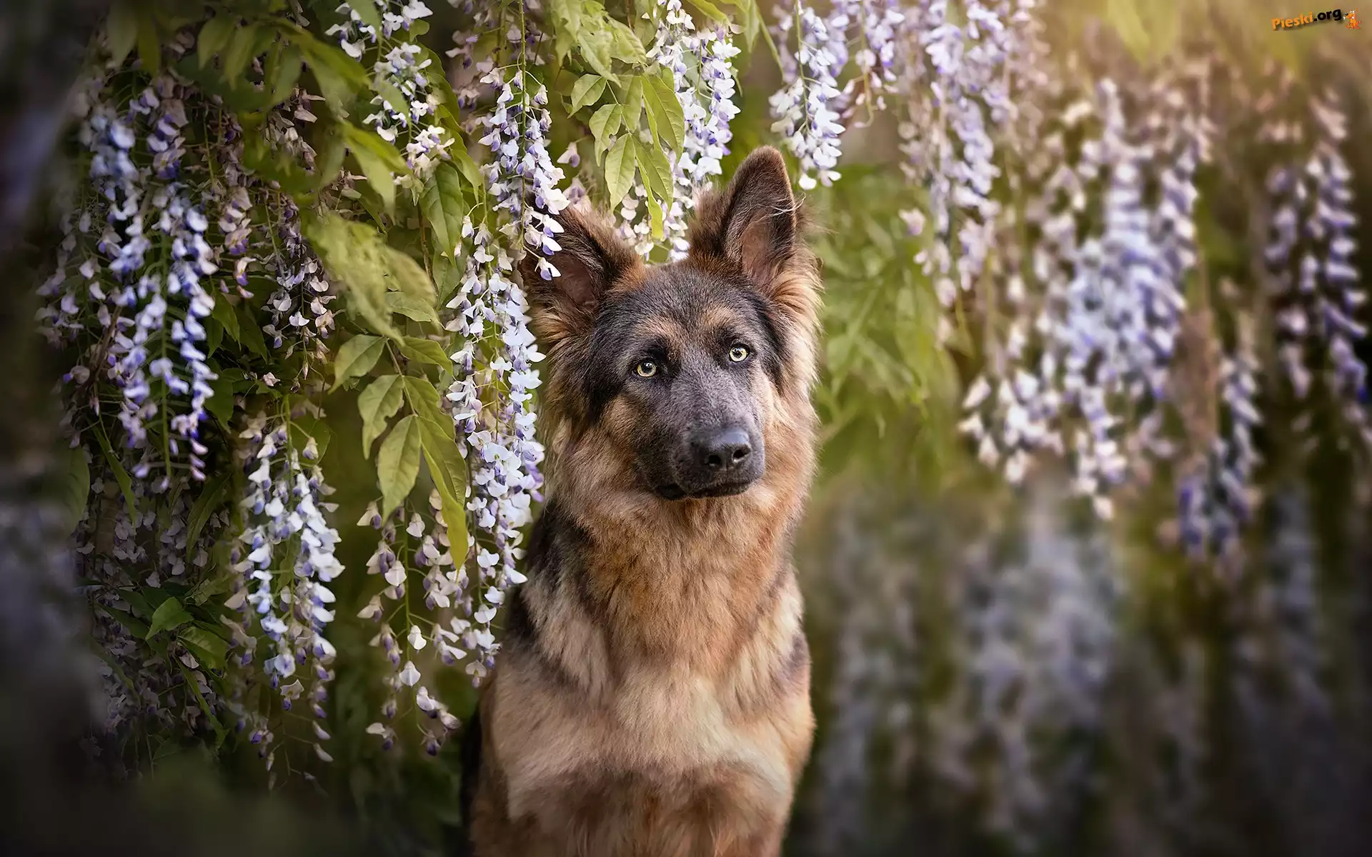 Glicynia, Kwiaty, Pies, Owczarek niemiecki