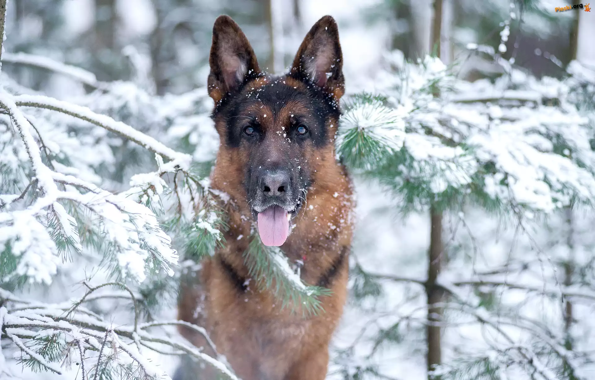 Świerki, Zima, Zaśnieżone, Owczarek niemiecki, Pieski