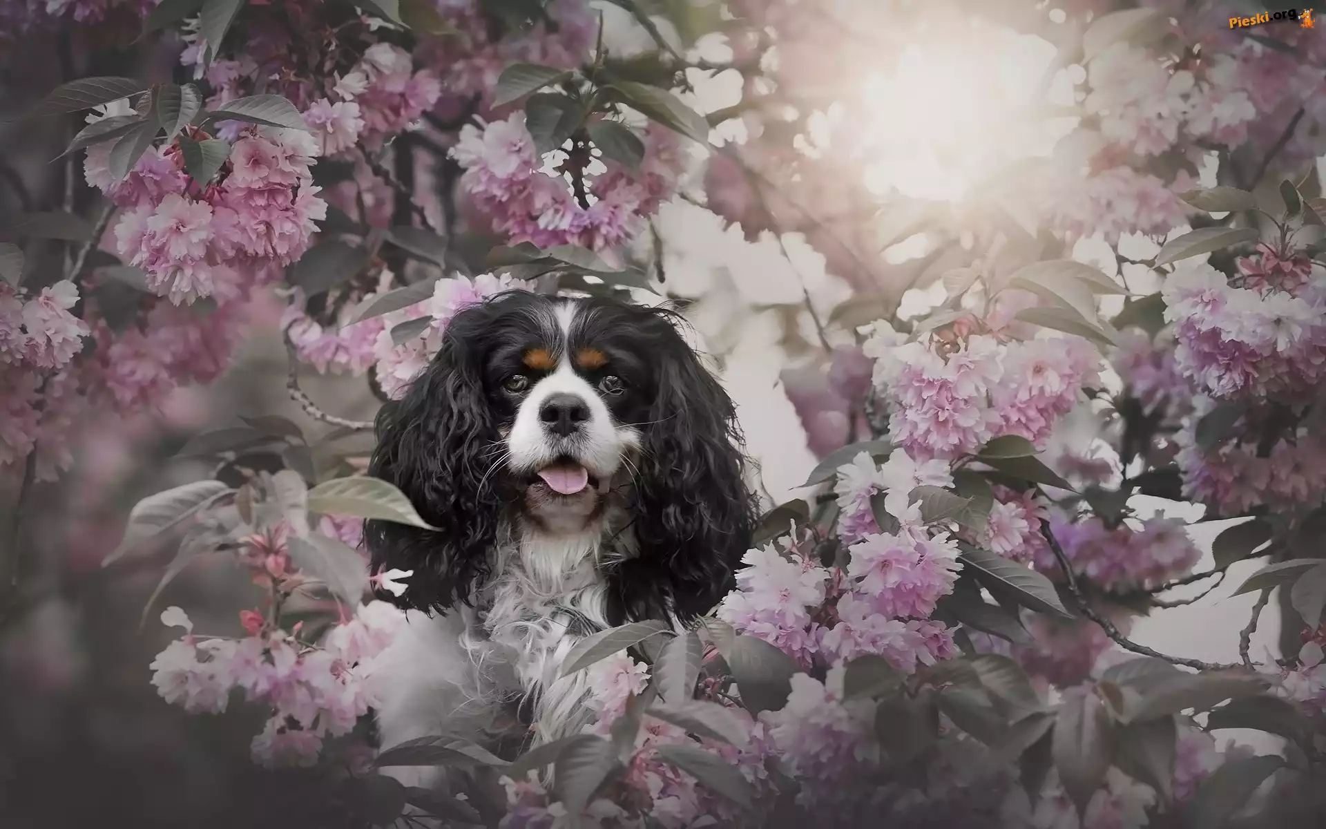 Drzewo owocowe, Pies, Wiśnia, Różowe, Cavalier king charles spaniel, Kwiaty, Gałązki