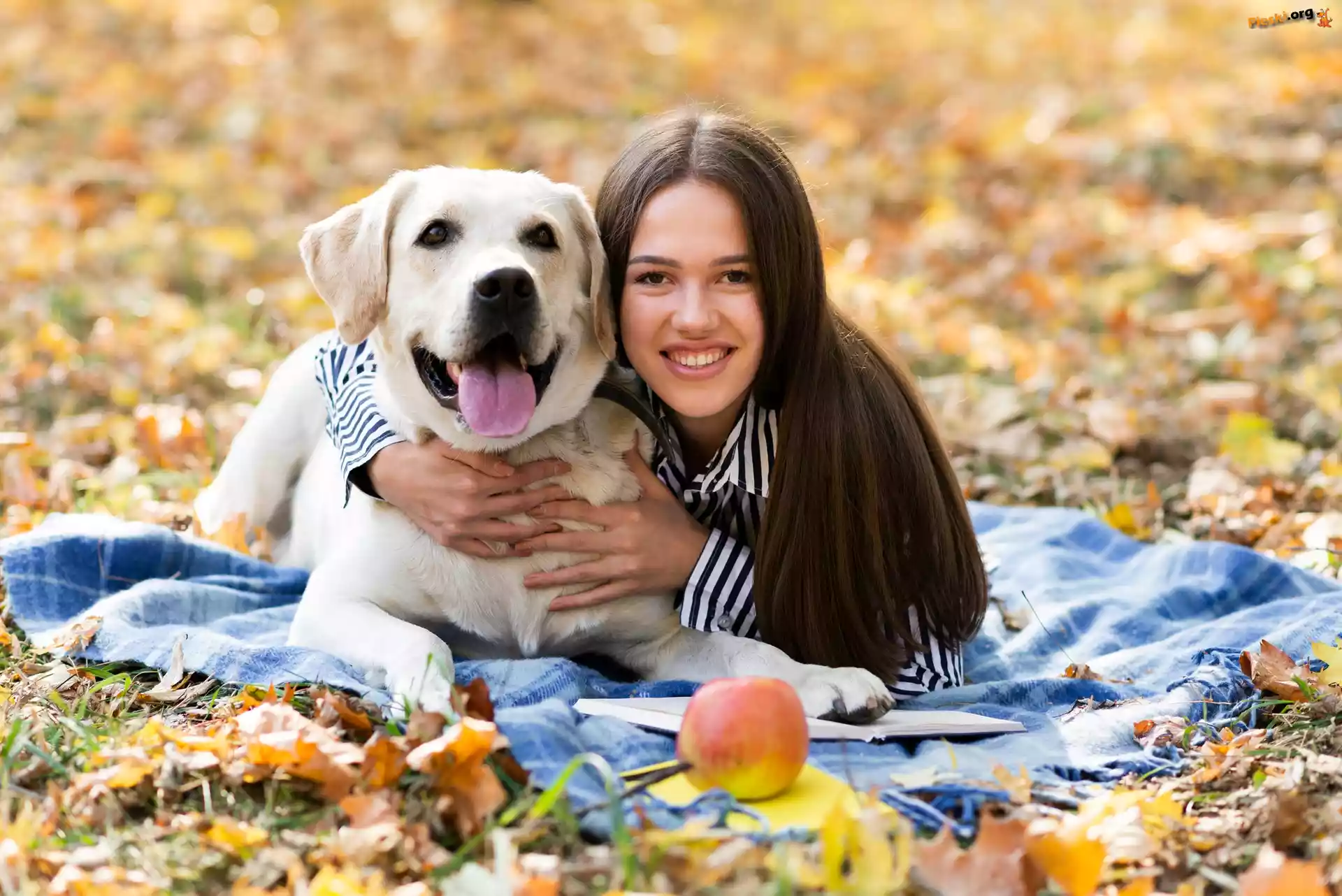Liście, Kobieta, Biały, Jabłko, Długowłosa, Pies, Labrador retriever