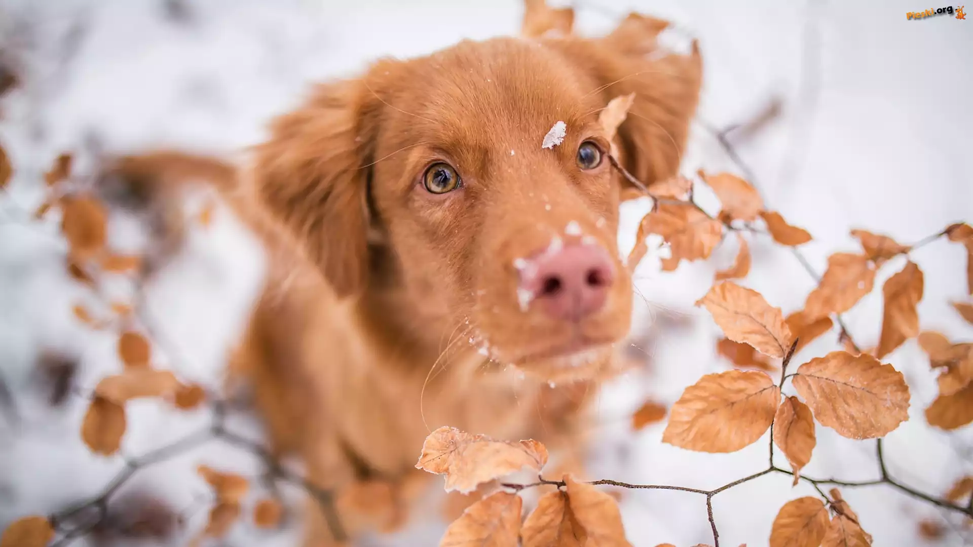Liście, Retriever z Nowej Szkocji, Pies, Mordka, Śnieg, Pieski