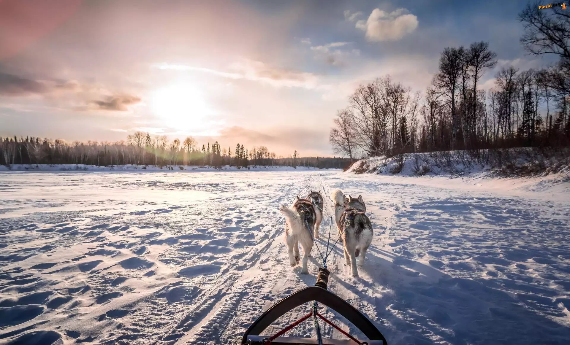Siberian husky, Zima, Psy, Zaprzęg, Pieski