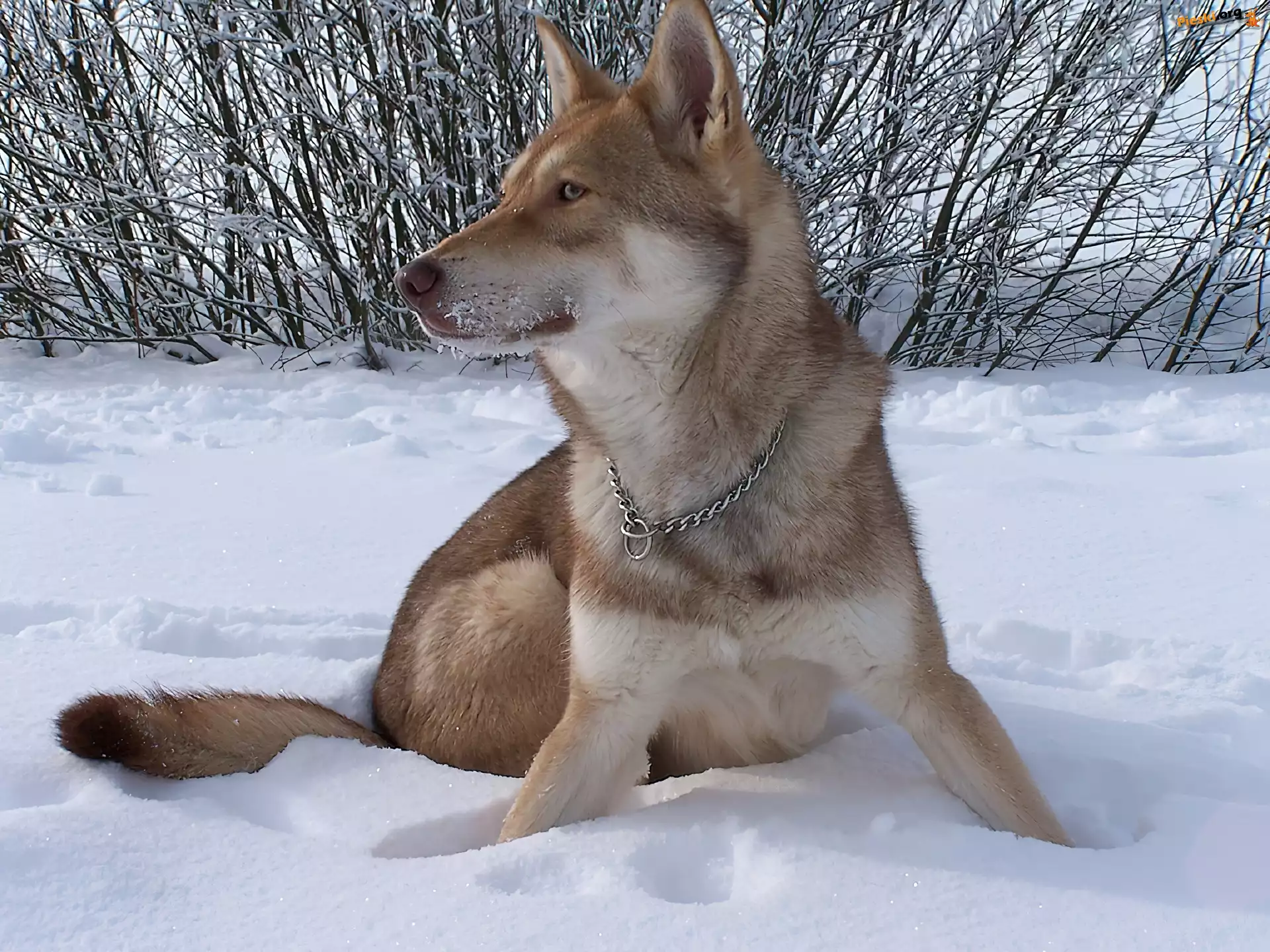 Saarlooswolfhond, śnieg, krzaki