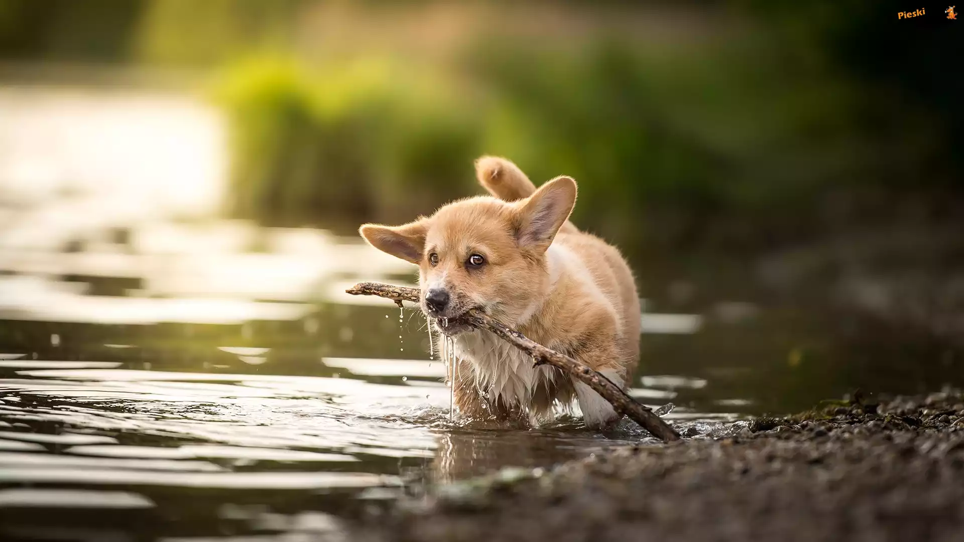Woda, Szczeniak, Pies, Welsh corgi pembroke, Patyk