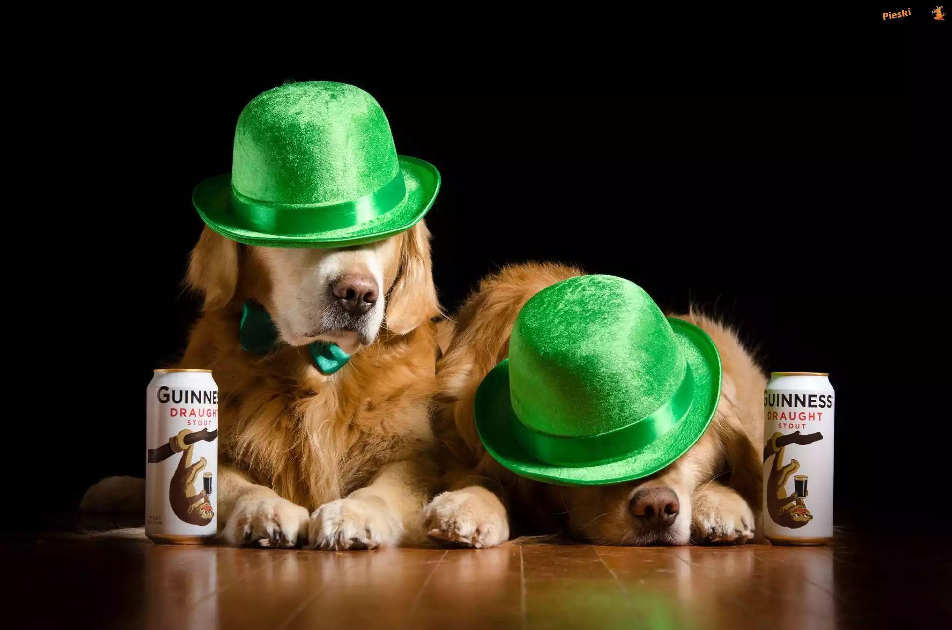 Puszki, Psy, Piwo, Zielone, Golden retriever, Kapelusze, Czarne tło, Pieski