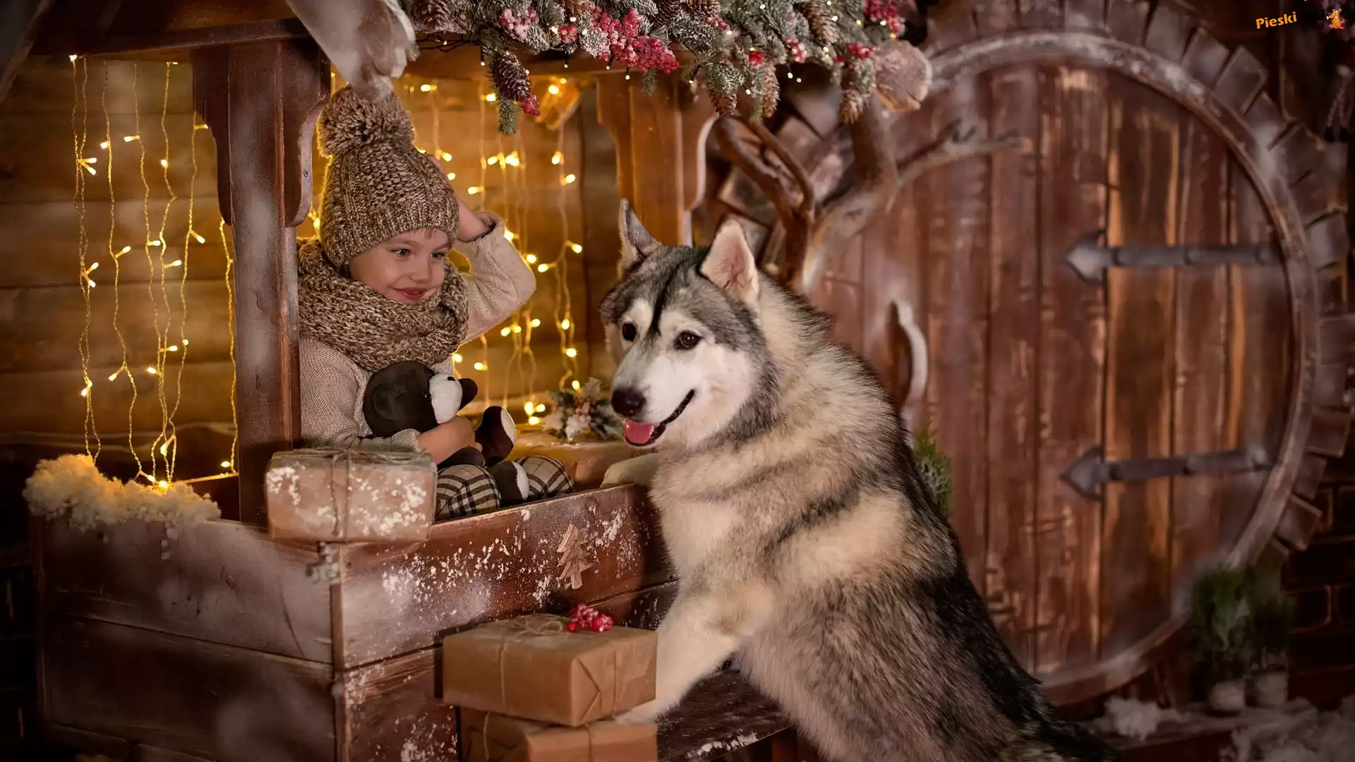 Świątecznie, Pies, Dziecko, Siberian husky, Światełka, Pieski