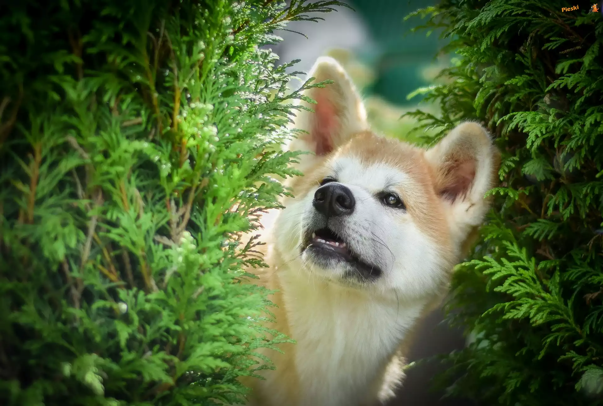 Zielone, Pies, Akita inu, Gałązki, Pieski