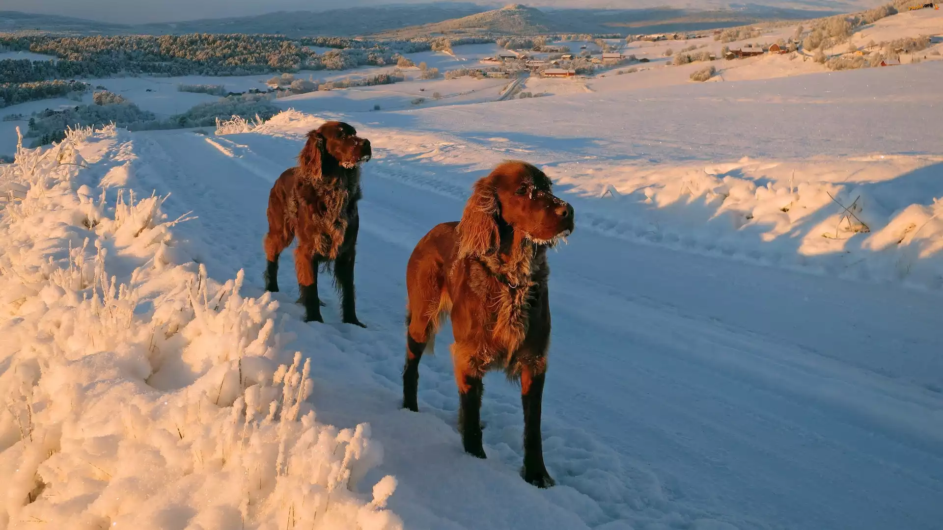 Zima, Psy, Dwa, Droga, Śnieg, Setery, Pieski