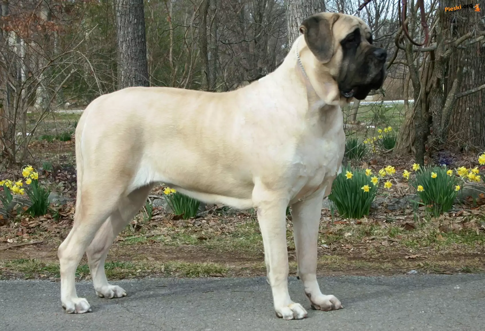 żółte, Mastif angielski, Mastiff, kwiatki, Pieski
